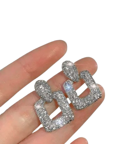 Each earring features a sleek geometric design adorned with shimmering rhinestones, adding a touch of elegance and sophistication to any ensemble. The combination of geometric elements and dazzling embellishments creates a striking visual impact that is sure to turn heads.